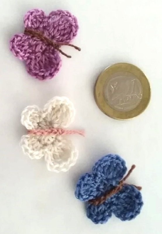 Mini-Schmetterling aus Restegarn. Geeignet als Dekoration, als Ohrring oder Lesezeichen. Vielleicht als kleines, niedliches Element an einem Babymützchen. Oder was Dir auch sonst noch so einfällt.
