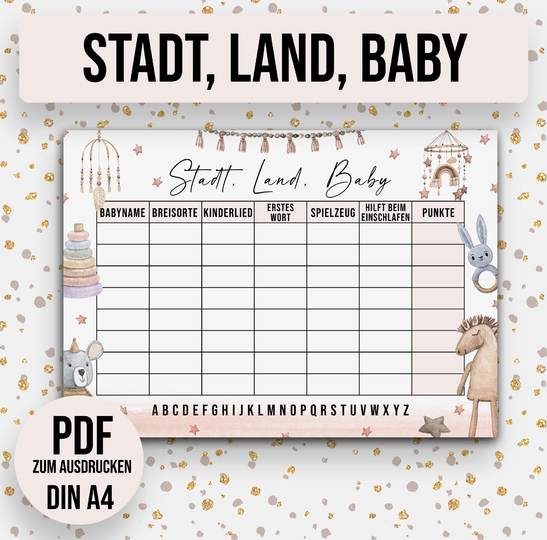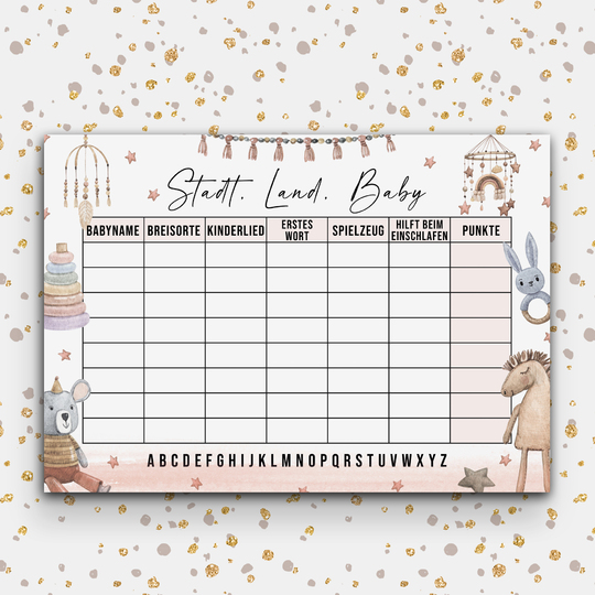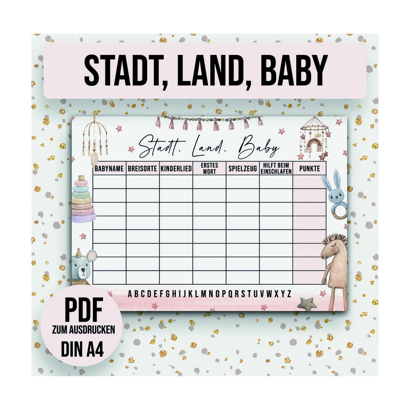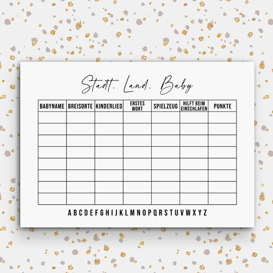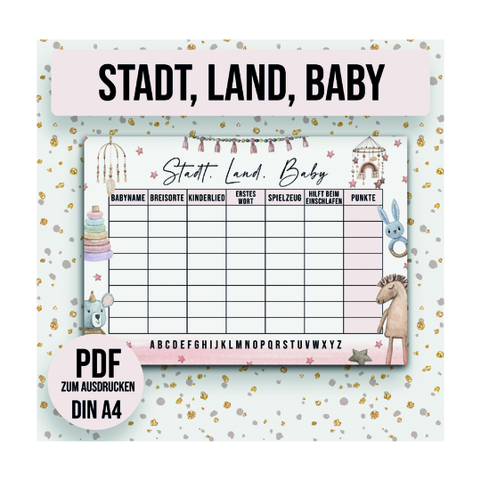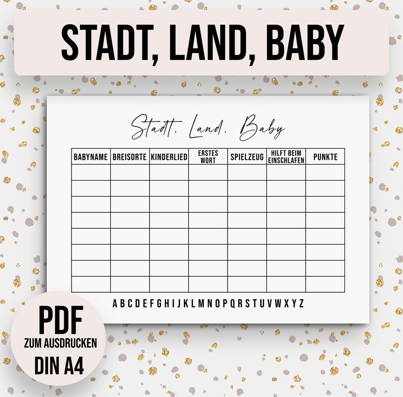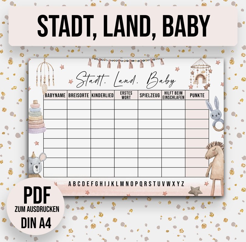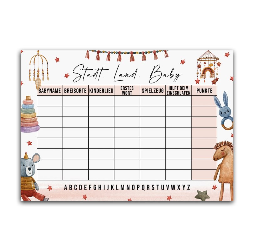 Damit Sie das Spiel Baby Stadt Land Fluss auf Ihrer Baby Shower spielen können, benötigt jeder Spieler eine entsprechende Vorlage.