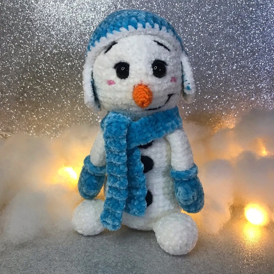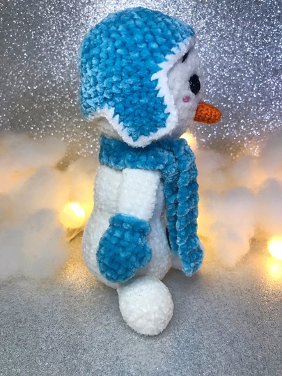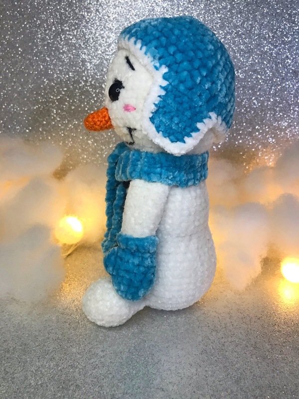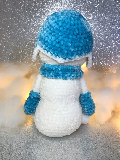 Die Größe von Pippo ist von den Materialien, die du verwendest und deiner Häkelweise abhängig. Ich habe bei der Anleitung ein etwas dünneres Chenillegarn verwendet und der Schneemann ist etwa 19 cm groß.