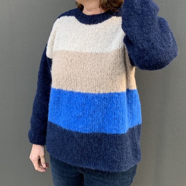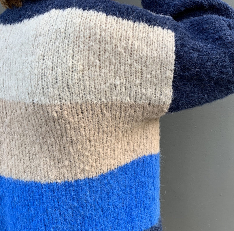 Der Pullover ist aus einer hochwertigen Alpakawolle gefertigt, die für ihre Weichheit und Wärme bekannt ist. Er hat eine dicke Strickstruktur, die ihn besonders gemütlich und kuschelig macht. Die Streifen auf dem Pullover sind in vier verschiedenen Farben gehalten, die harmonisch miteinander kombiniert sind. Die Farben des Pullovers sind dunkelblau, stahlblau, beige und hellbeige.