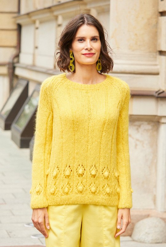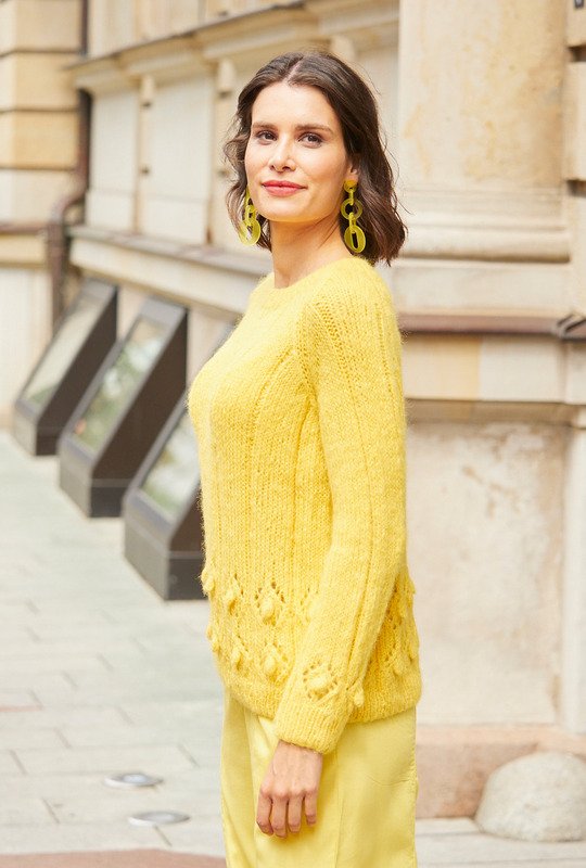 Ein Raglanpulli aus prinzipiell simplen Rippenstreifen in glatt rechts und glatt links bekommt eine enorme Aufwertung durch das Ajourmuster mit dicken Noppen oberhalb des Bunds – und auch an den Ärmeln. Die Raglanschrägungen werden mit einem schmaleren Rippenmuster gearbeitet, die betonten Abnahmen heben die Schrägungen hervor. 1/1-Rippen bilden die Bündchen und die Halsausschnittblende. Das Garn aus halb Alpaka, halb Schurwolle ist besonders flauschig und weich, die sonnengelbe Farbe lässt gute Laune aufkommen. Eine Anleitung steht in den Größen 36/38 und 44/46 zur Verfügung.