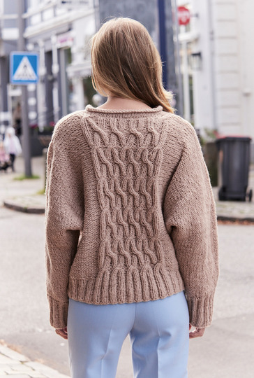 Das dekorative Zopfmuster in der Mitte von Vorder- und Rückenteil, das sich aus dem 2/2-Rippenmuster des Bunds entwickelt, wird flankiert von glatt rechts. Der Schnitt ist unglaublich bequem und ideal, wenn man eine etwas größere Oberweite hat, denn die Maschen für die Ärmel werden nach dem Bund in Federmausform zugenommen. Der runde Halsausschnitt bekommt einen kleinen Rollrand aus rechten Maschen. Eine Anleitung für dieses Modell aus sandfarbener Schurwolle mit etwas Polyester-Beimischung gibt es für die Größen 36 – 40 und 42 – 46 sowie 48 – 52.