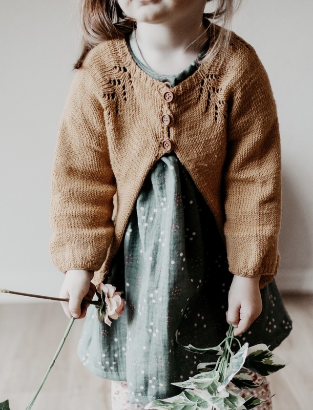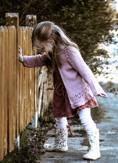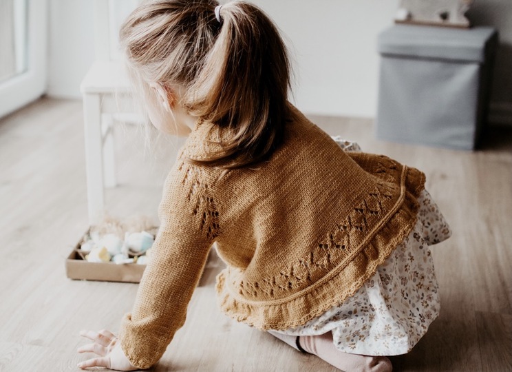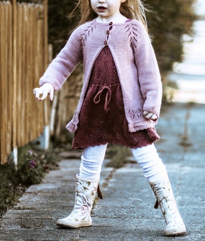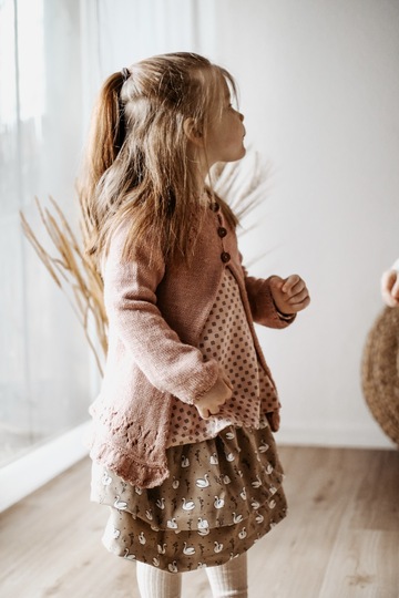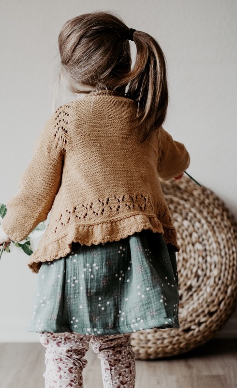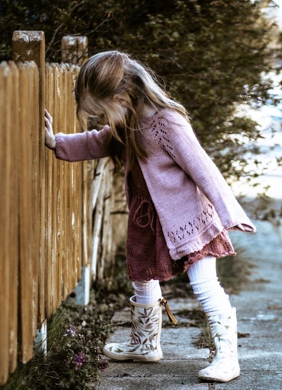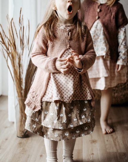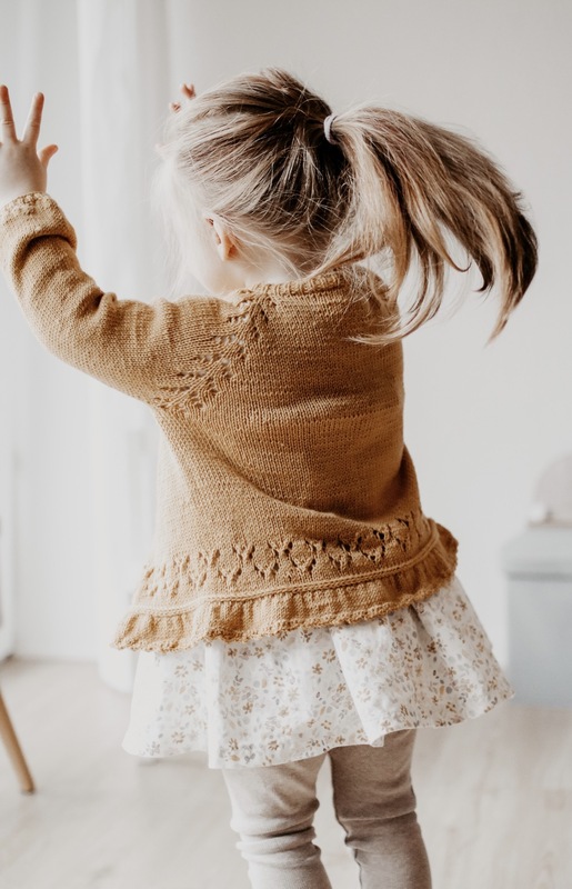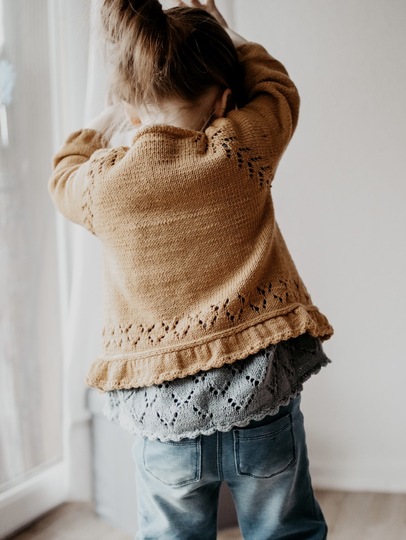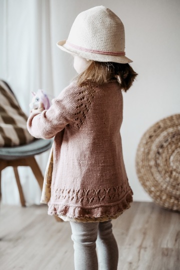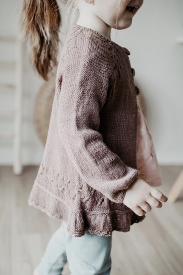 Edla Kofte Lykken din ist ein süßer, schlichter Cardigan im nordischen Stil für kleine und und große Mädchen. Die elegante Raglanlinie und das schöne Ajourmuster am unteren Saum, sowie die Rüsche mit abschließender Häkelborte sorgen für das gewisse Etwas und jede menge Strickspaß.