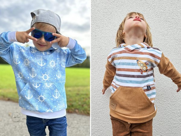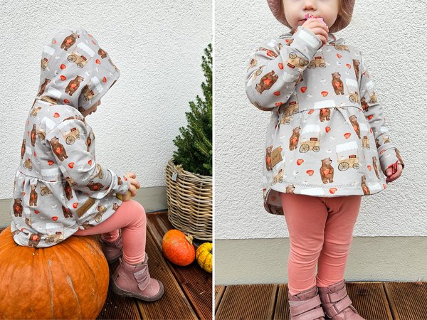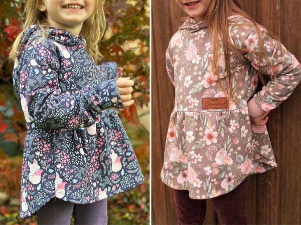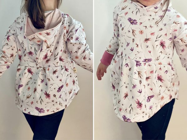 Du kannst ihn als Hoodie mit Kapuze nähen oder als Sweater mit Halsbündchen, mit oder ohne Bauchtasche und auch die verspielte Variante mit gerafftem Rockteil hat 2 verschiedene Varianten.