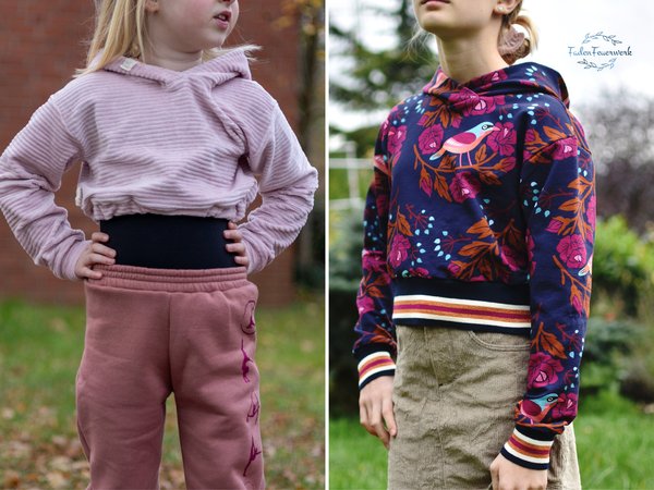 SELMA ist ein lässiger Hoodie mit verschiedenen Optionen. Ob klassisch mit Bauchtasche, mädchenhaft mit gerafftem Rockteil oder als bauchfreier Crop-Pulli - SELMA ist immer wieder anders.