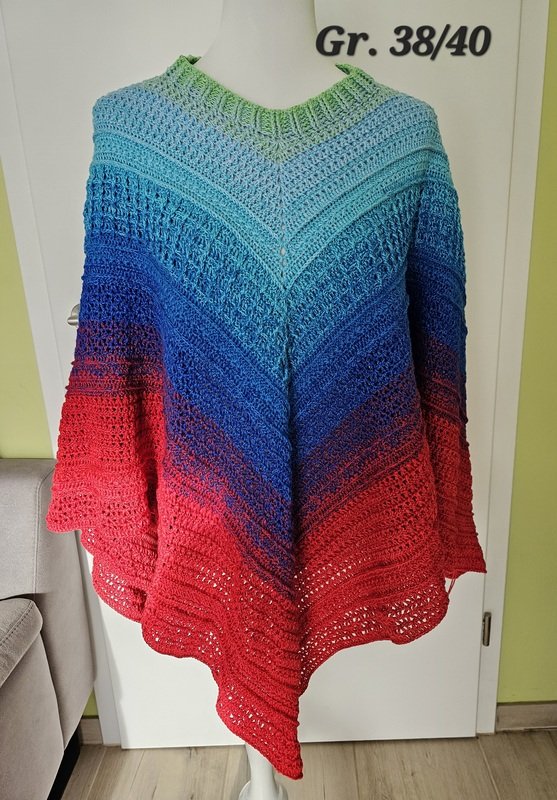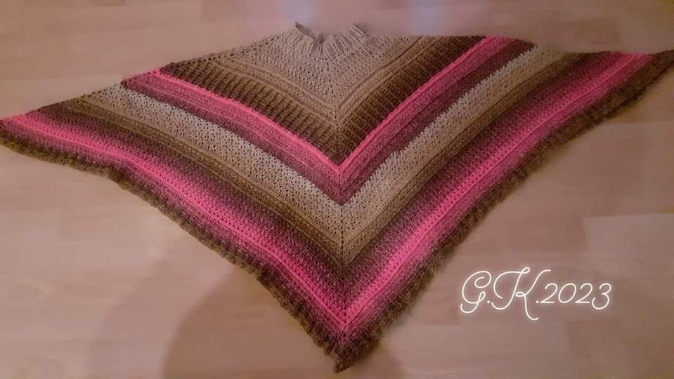 Dies ist die Anleitung für einen Poncho. Er wird RVO gearbeitet. Dies erspart das Zusammennähen. Die Muster können in jeder beliebigen Reihenfolge gehäkelt werden. Dies ist in der Anleitung erklärt. Auch ist die Anleitung auf alle Größen anpassbar.