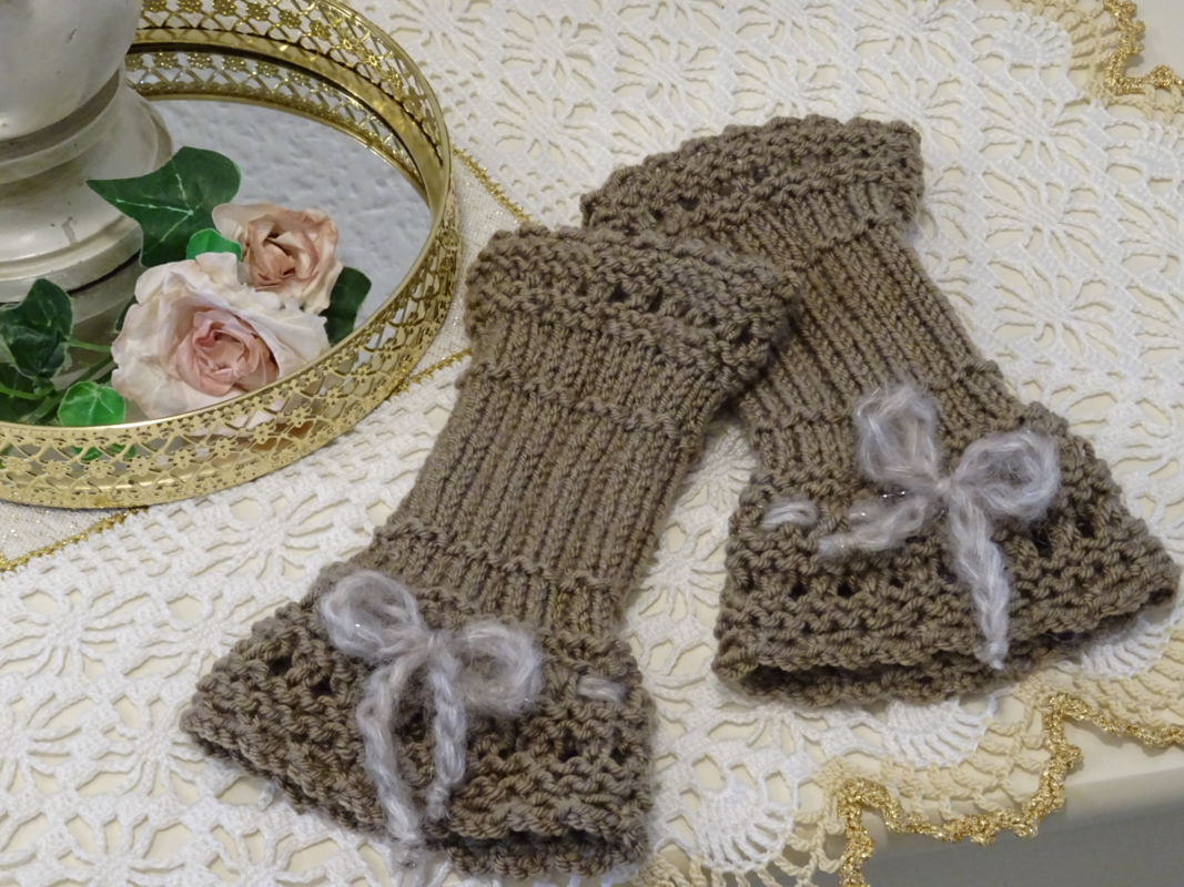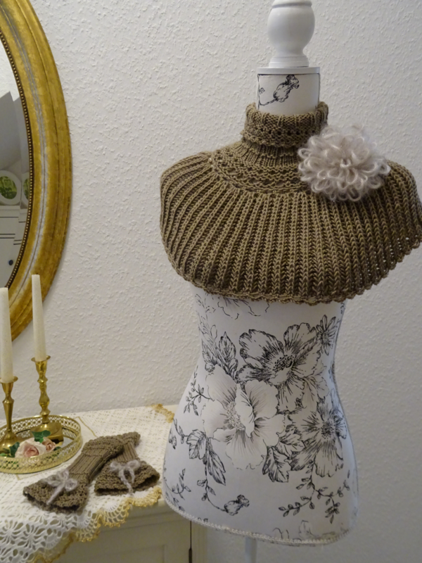 Mit dieser Strickanleitung kann ein 3teiliges Strickset im viktorianischen Stil und in 2 Farbvarianten in relativ kurzer Zeit nachgearbeitet werden. Das Set besteht aus einem überaus variablen Schulterwärmer, einem Paar bezaubernder Stulpen und einem dekorativen Schlingenpompom. Schulterwärmer und Stulpen werden gestrickt, der Schlingenpompom gehäkelt.