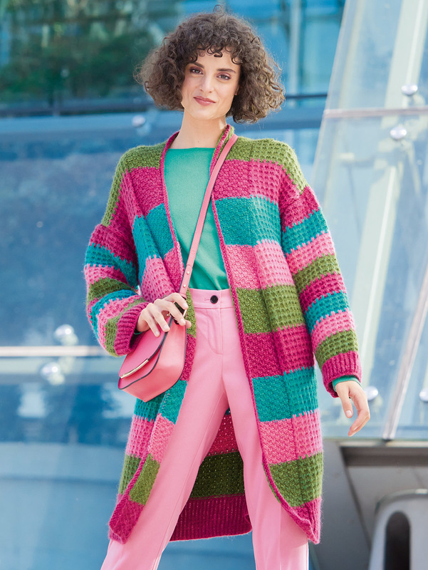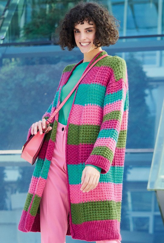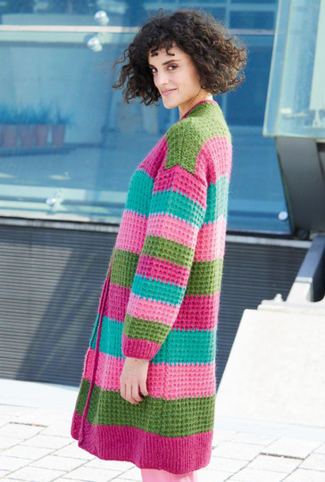 Was wäre die Strickwelt ohne Hebemaschen? Bestimmt um einige tolle Modelle ärmer! Zum Beispiel um dieses hier. Diese tolle verschlusslose Jacke wird mit einem schicken Hebemaschenmuster gestrckt, welches ihm eine ganz besonders ausdrucksstarke Struktur verleiht. Alle Teile wie Rückenteil, Vorderteile und Ärmel werden separat gestrickt und zu einem späteren Zeitpunkt zusammengefügt. Sogar der aparte Schalkragen wird direkt an das Vorderteil gestrickt und am Schluss am Rückenteil geschlossen. Perlmuster und Hebemaschenmuster wechseln sich mit den verschiedenen Farben ab. So wird es beim Stricken auf keinen Fall langweilig. Mit der ausführlichen Strickschrift und Beschreibung in dieser Anleitung ist das Nacharbeiten überhaupt kein Problem.