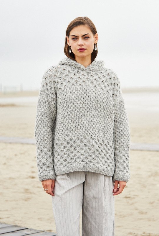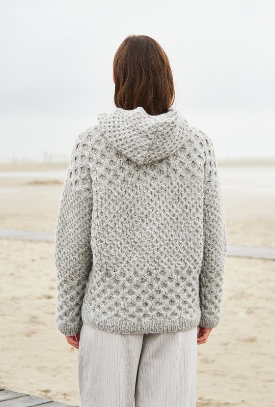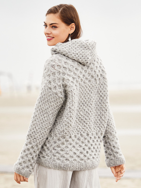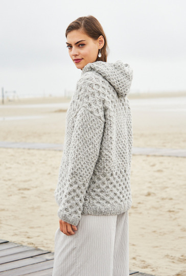 Das hellgraue Schurwolle-Alpaka-Polyamid-Mischgarn dieses großzügig geschnittenen Outdoor-Pullis hält wunderbar warm. Und falls der Wind mal etwas kälter pfeift, schützt die Kapuze Kopf und Ohren. Zwei unterschiedlich große Wabenmuster sorgen für eine spannende Optik. Die Bündchen werden im 1/1-Rippenmuster gestrickt und die Kapuze bekommt für einen sauberen Abschluss eine Kantenverzierung aus je einer Runde festen Maschen und Krebsmaschen. Die Schultern fallen großzügig über und auch die Ärmel haben eine generöse Weite. Eine Anleitung gibt es für die Größen 36/38, 40/42 und 44/46.