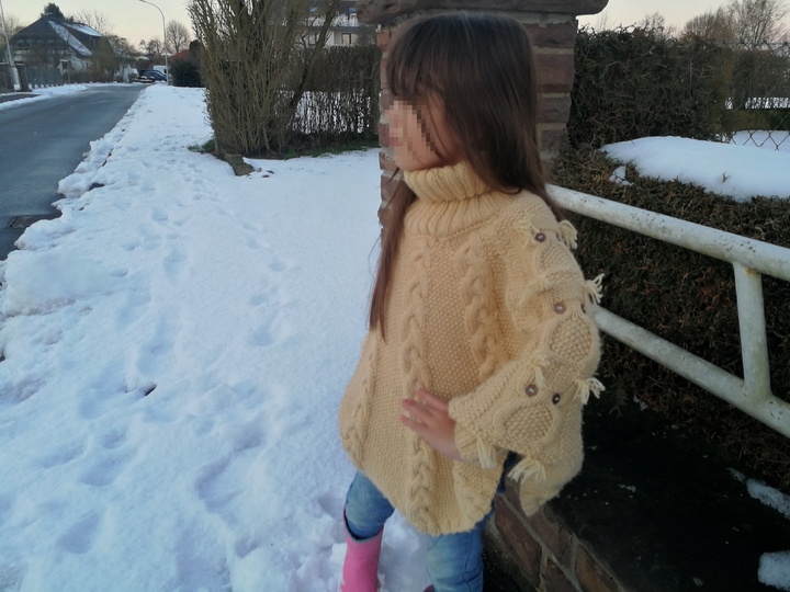 Die Ärmel sorgen beim spielen dafür das sich der Poncho nicht dreht, ebenfalls bleiben die Arme durch die Ärmel schön warm. Auch der Rollkragen gibt ein Rundum kuscheliges Gefühl.