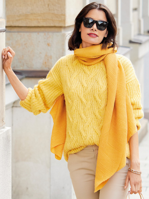 Dieser Pullover aus einem weichen Alpaka-Baumwolle-Schurwolle-Gemisch drängt sich nicht in den Vordergrund, sondern umschmeichelt die Silhouette soft. Dennoch fällt die Farbe als sonniges Highlight sofort ins Auge. Das Muster aus Halbpatentzöpfen wird nur in der Mitte von Vorder- und Rückteil gestrickt, die Ärmel sind ganz im Halbpatent gearbeitet. Saum- und Ärmelbündchen sowie die Halsausschnittblende sind als 1/1-Rippen gearbeitet. Dazu ein unauffälliger Schnitt: gerade eingesetzte Ärmel lassen die Schultern sanft überfallen. Die Anleitung dazu gibt es für die Größen 38/40, 42/44 und 46/48.