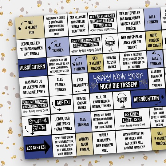 Ihr benötigt einen Würfel, Spielfiguren und ein Getränk Eurer Wahl.