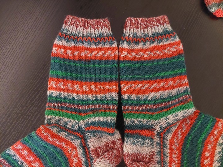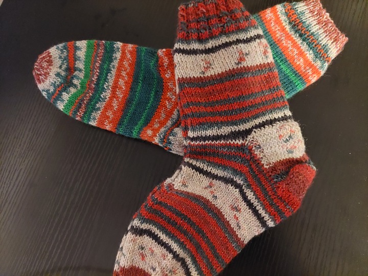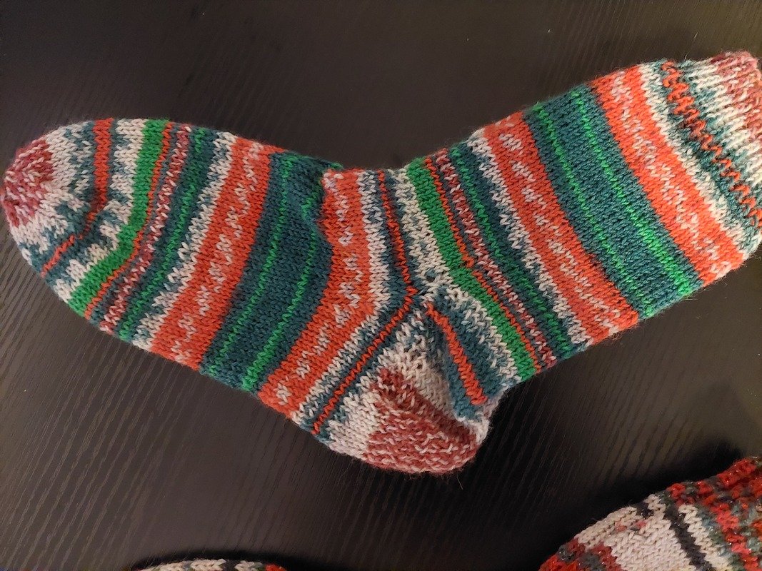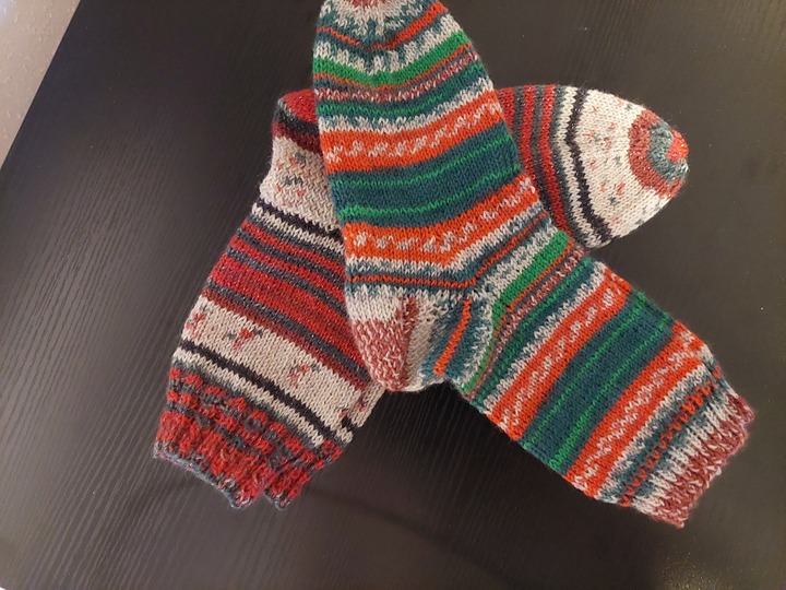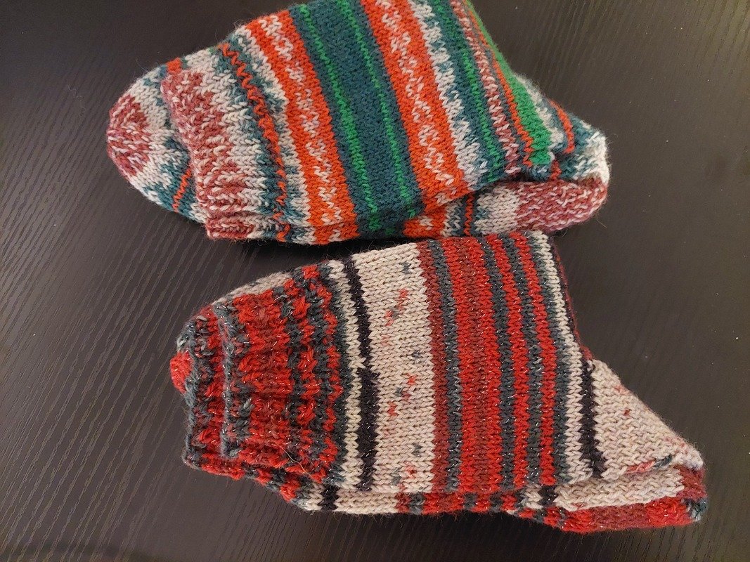 Diese handgestrickten Socken in festlichen Weihnachtsfarben sorgen für kuschelig warme Füße an kalten Wintertagen. Die leicht verstärkte Ferse macht sie besonders strapazierfähig und langlebig, sodass sie über viele Winter hinweg Freude bereiten.