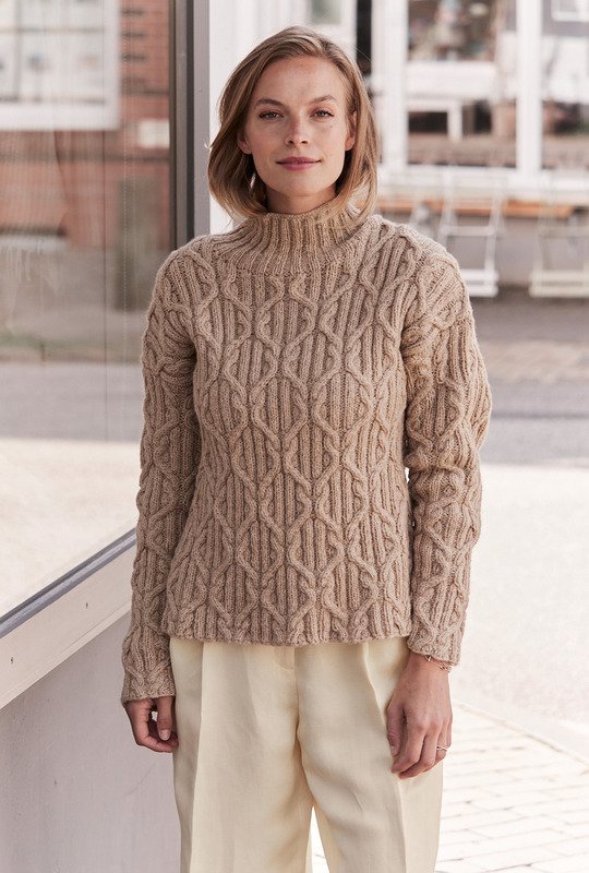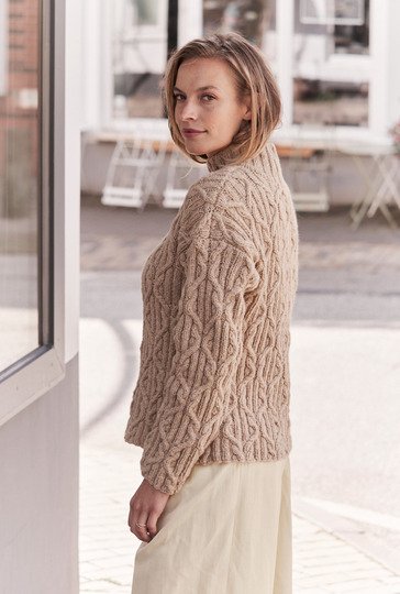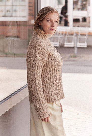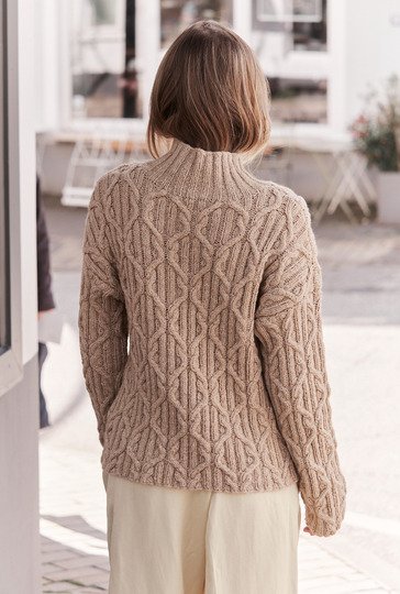 Beige ist die Farbe des Understatements und extravagant dazu das Muster: Dieser kastig geschnittene Pullover aus einem superweichen Alpakamischgarn lässt sich perfekt sowohl im Büro als auch zum Casual Look tragen. Durch den geraden Schnitt entstehen die überfallenden Schultern. Das plakative Allover-Zopfmuster ist genau das Richtige für alle, denen eintöniges Geradeausstricken zu langweilig ist. Jedoch der hohe Turtleneckkragen im ansonsten weiten runden Halsausschnitt bekommt ein breites Rippenmuster. Eine Anleitung hierfür steht in den Größen 38/40, 44/46 und 50/52 zur Verfügung.