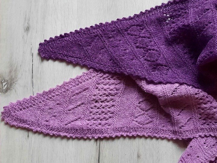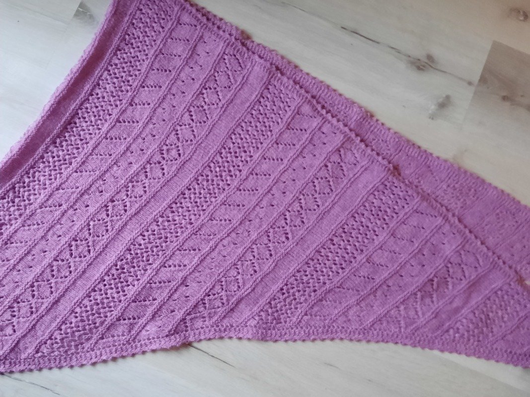 Ich habe von diesem Tuch zwei Versionen gestrickt: Eine mit einem Lochrand an den beiden kürzeren Kanten und eine ohne den Lochrand. Beide Versionen werden in der Anleitung erklärt.