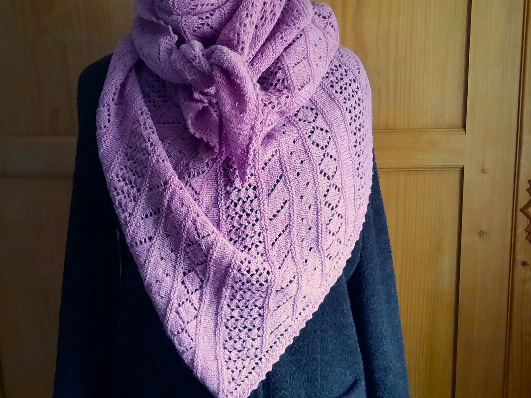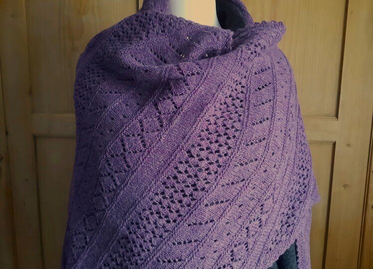 Das Lace-Tuch wird mit ganz einfachen Mustern gestrickt, die aber in der Kombination doch einen tollen Effekt ergeben. Dadurch, dass das Tuch quer gestrickt ist, gibt es nie so lange Reihen, dass man die Lust zu verlieren droht. Im Gegenteil, nach der Hälfte werden die Reihen immer kürzer. Und die Form des Tuches ist so flexibel, dass es nicht nur als Schultertuch, sondern auch als Schal getragen werden kann. Dazu trägt auch das relativ feine Material bei. Es fühlt sich zunächst etwas robust an, wird aber beim Waschen deutlich weicher und fällt sehr schön. Außerdem ist die Wolle besonders nachhaltig, da GOTS-zertifiziert.