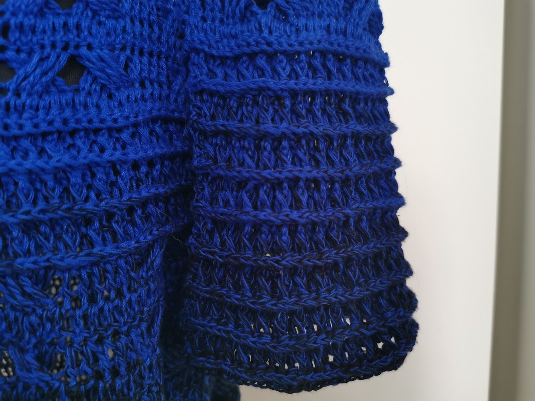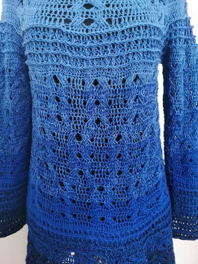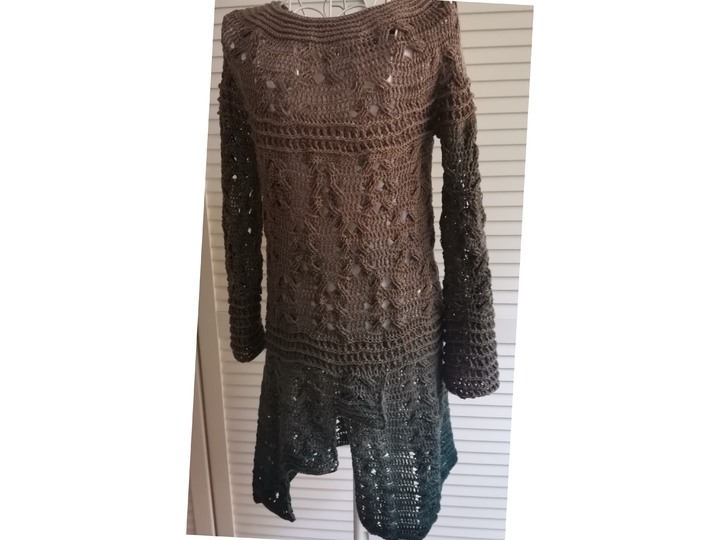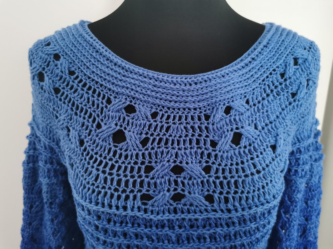 Der Pullover wird in einem Stück von oben nach unten gearbeitet, die Ärmel werden extra direkt angehäkelt und er kann spielend leicht an alle Größen angepasst werden.
