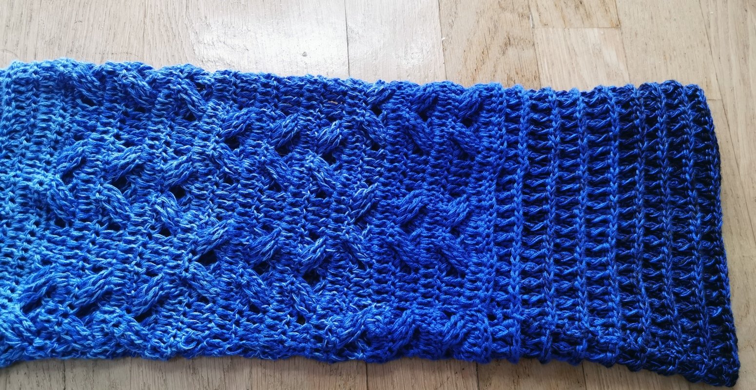 Das einfach zu häkelnde Zopfmuster ist in der Anleitung mit Bildern und Text genau erklärt.