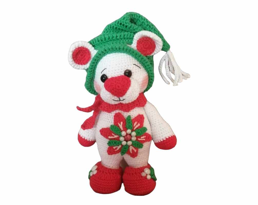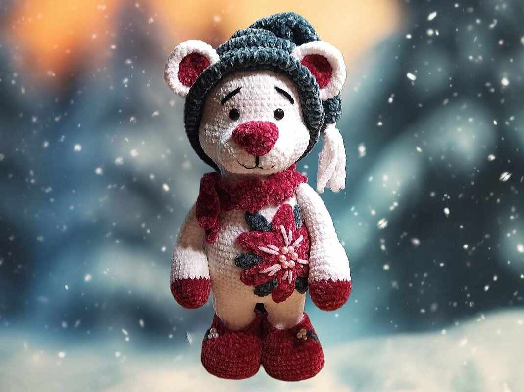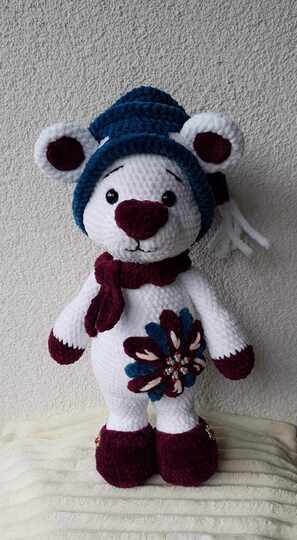 Mit dieser Häkelanleitung zauberst du dir im Nu einen zuckersüßen Eisbär. Mit Zipfelmütze, Schal und Schuhen hat er sich eingepackt. Eine tolle Blüte schmückt seinen Bauch. Ach als Geschenk, in der Winter- und Weihnachtszeit, bestimmt eine gute Idee.