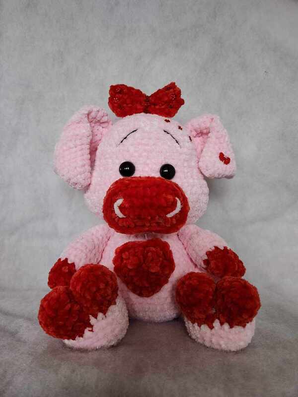 Das Schweinchen Piggy Sue habe ich mit Himalaya Velvet und einer Nadelstärke von 3,5 gehäkelt. Es hat bei mir eine Größe von 28 cm.