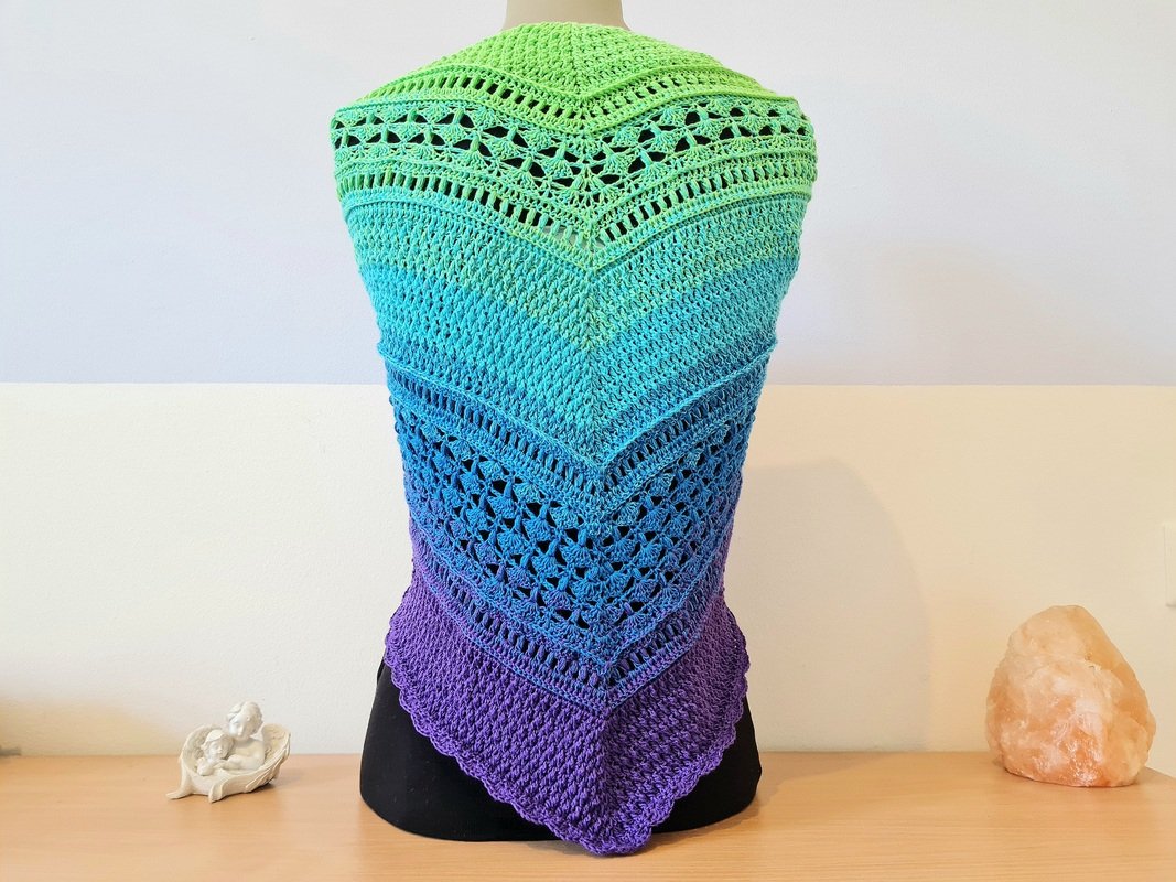Das Tuch wurde mit ca. 1305 Metern 3- fädigem Farbverlaufsgarn mit einer Nadelstärke 3,5 gehäkelt. Das Tuch ist ca. 200 cm lang und ca. 54 cm tief.