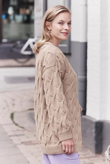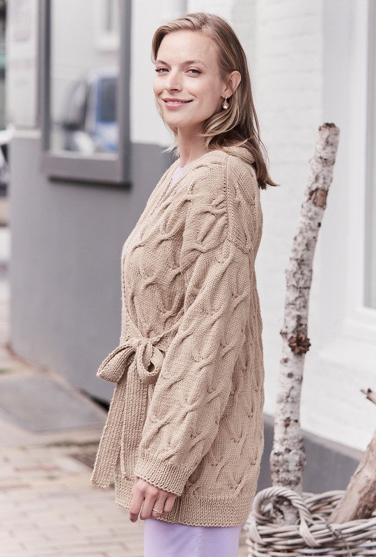 Dieser Cardigan aus edlem Garn aus Schurwolle mit Seide- und Kaschmir-Beimischung, ist aufgrund des Allover-Zopfmusters ein perfekter Alltags-Allrounder, er durch seine hüftlange Form sehr figurfreundlich ist. Die Verschlussblende im Rippenmuster wird gleich mitgestrickt. Das ebenfalls im Rippenmuster gestrickte Bindeband wird nur einseitig geschlossen, was einen zusätzlichen Blickfang ergibt. Alle Teile sind ganz gerade geschnitten, sodass nirgends zu- oder abgenommen werden muss – es entsteht faktisch ein V-Ausschnitt und weit überfallende Schultern. Die Anleitung kann für die Größen 38/40, 44/46 und 50/52 downgeloadet werden.