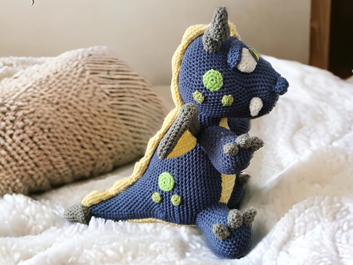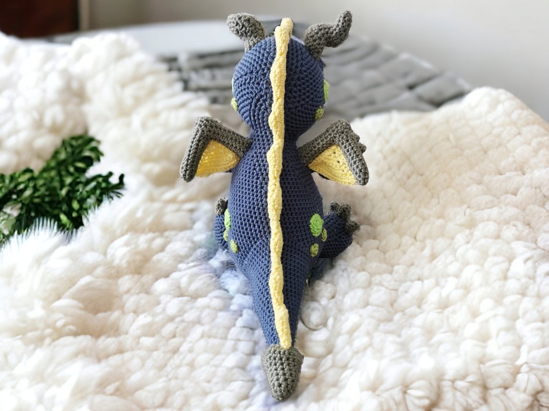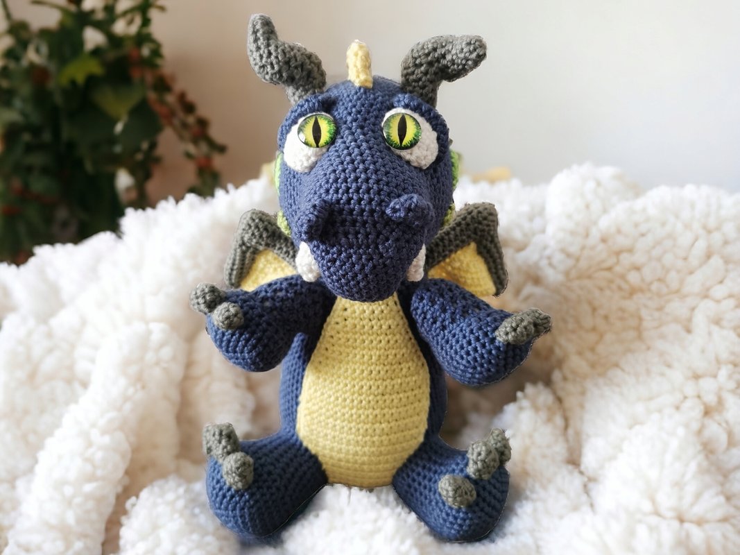 Der Fertige Drache wird ca. 24cm. Natürlich kann die Größe variieren, je nachdem ob man fest oder locker häkelt. Auch die Wahl der Wolle ist entscheidend. Ich selbst häkle mit Baumwollgarn 125m/50g (100% Baumwolle).