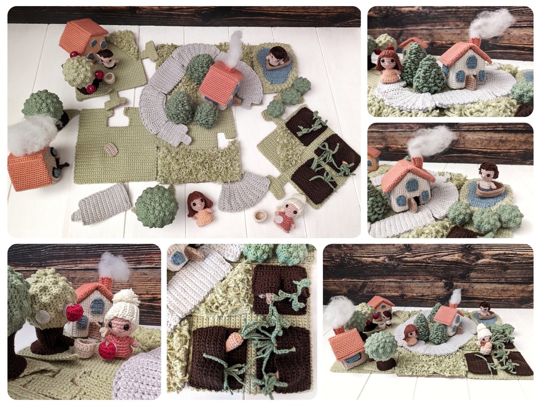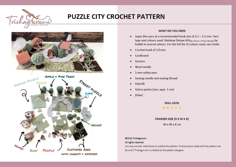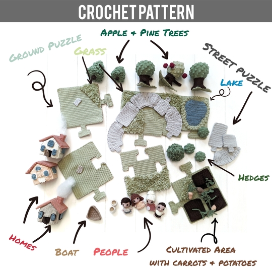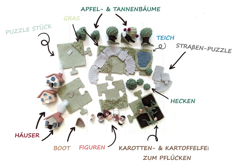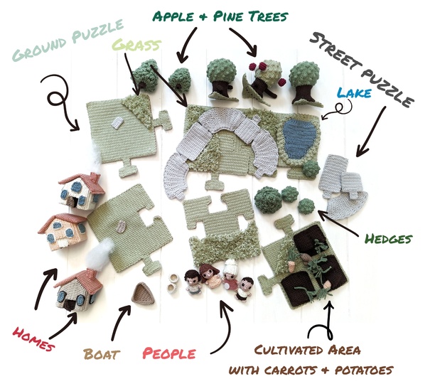 Die Häkel-Puzzle-Stadt besteht aus folgenden Elementen: