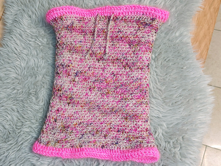 Der Cowl auf den Bildern ist ca. 40 cm lang und ca. 24 cm breit. Die Größe kann jedoch durch Anpassung der Anfangsmaschenzahl leicht angepasst werden. (Beachte hierbhei bitte den geänderten Wollverbrauch!)