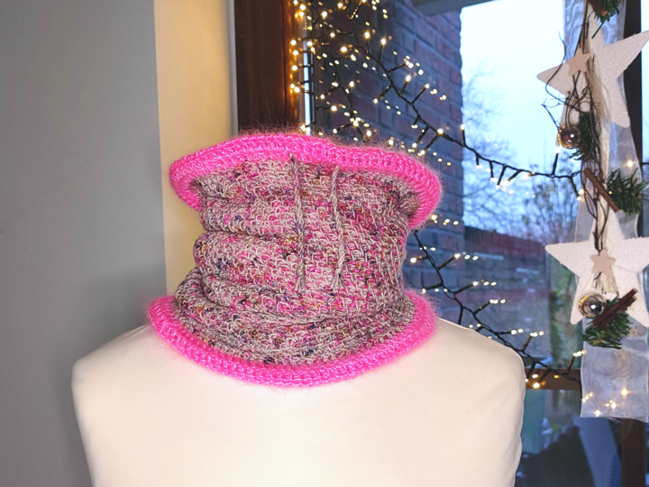 Dieser kuschelige Cowl oder Halswärmer ist der perfekte Begleiter für die kalte Jahreszeit. Er ist aus zwei Lagen gefertigt und dadurch sehr dicht und wärmend.