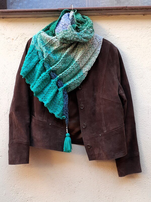 TUGELA ist ein Schaltuch in der Form eines spitzen Dreiecks mit einem Zopf und hübschem Wellenmuster.