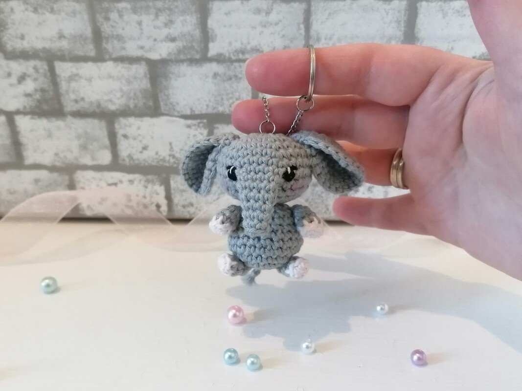 Diese Anleitung vermittelt nicht die Grundlagen des Häkelns. Sie besteht ausschließlich aus schriftlichen Anweisungen und Schritt-für-Schritt-Fotos, die erklären, wie man einen Amigurumi-Elefanten als Schlüsselanhänger häkelt.