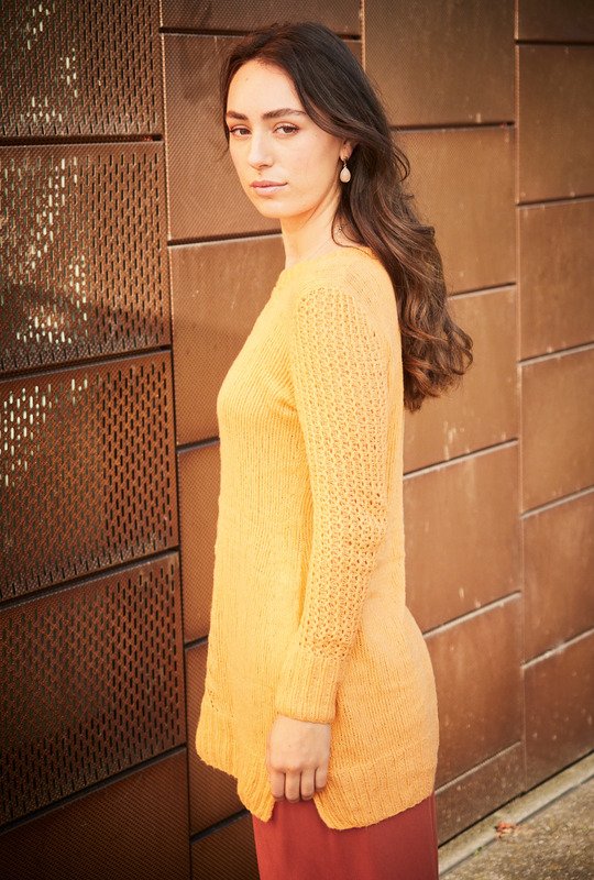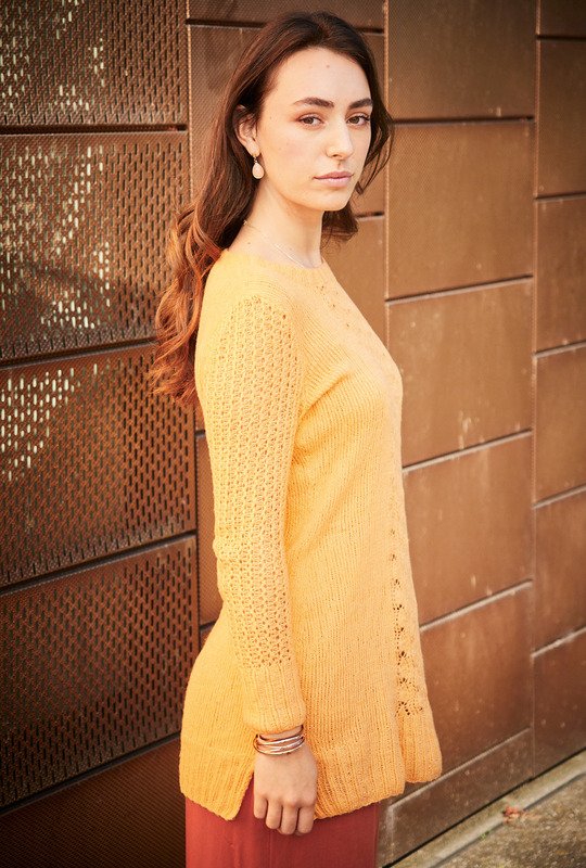 Der bis über die Hüften reichende orangefarbene Pullover aus einem leichten und zugleich flauschig-weichem Mischgarn aus Baumwolle und Polyamid wird mit einem breiten Blattmusterstreifen im Vorderteil verziert. Neben dem Ajourmuster wird glatt rechts gestrickt; die Ärmel mit Armkugel haben ein kleines Lochmuster. Der breite Saumbund, die Ärmelbündchen und die Halsausschnittblende sind in 2/2-Rippen gearbeitet. Ein Pulli mit Raffinesse, der jeder ambitionierten StrickerIn gefallen wird. Durch die lange Form lassen sich gut ein paar Pölsterchen an der Hüfte verstecken. Eine Anleitung steht in den Größen 36/38, 40/42) und 44/46 zum Download bereit.