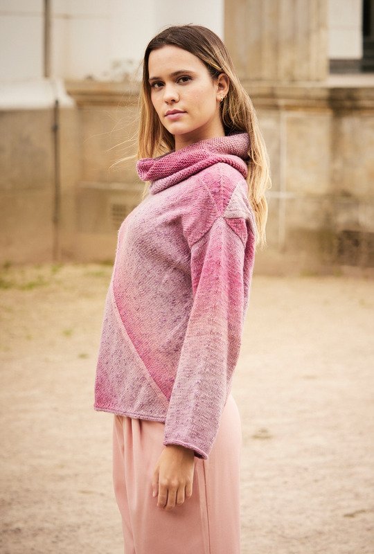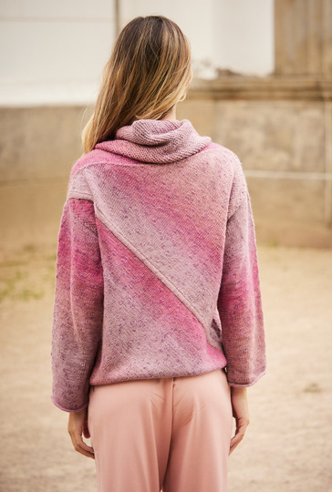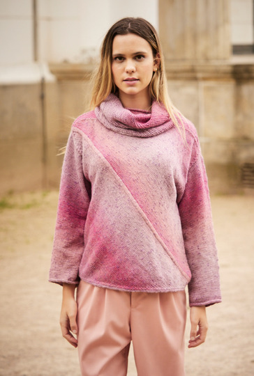 Dieser diagonal glatt rechts gestrickte Pulli wird mit einem I-Cord begonnen, an dessen beiden Seiten die diagonalen Flächen (Dreiecke) nach oben und unten angestrickt werden. Die kurze Passe kommt dann noch an das obere Dreieck. Die Ärmel sind ganz gerade von oben nach unten direkt angestrickt, das erspart das Einnähen. Perfekt dazu: der ebenfalls diagonal gearbeitete, kraus rechts gestrickte Loop. Das Garn aus Schurwolle mit Baumwolle trägt den schattierten Farbverlauf von Flieder bis Rosa bereits in sich. Eine Anleitung steht für die Größen 36/38, 40/42 und 44/46 zur Verfügung.