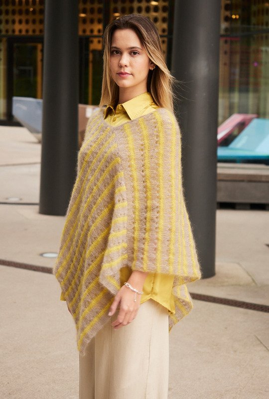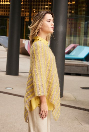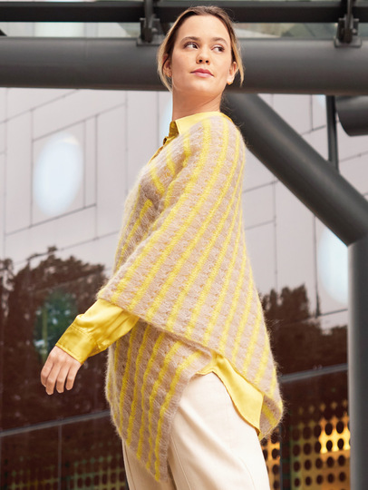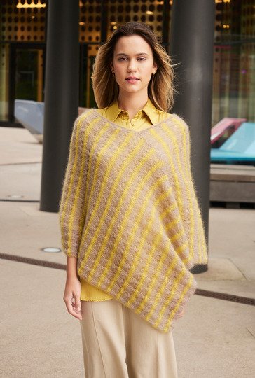 Der Poncho wird aus zwei Rechtecken gearbeitet, bei denen nach Fertigstellung die kurze Seite an die lange genäht wird. Den so entstandenen Halsausschnitt verzierst du schließlich noch mit einer glatt rechts gestrickten Blende in Taupe. Nicht schwer ist das plastische Fantasierippenmuster; hierfür werden einfach breite Rippen und eine Reihe Lochmuster in Taupe gestrickt, gefolgt von kraus rechts und kraus links gestrickten Reihen in Zitronengelb. Das edle Garn aus Mohair und Seide ist so leicht, dass du den Poncho kaum spüren wirst. Die Anleitung ist für die Größen 36 – 40, 42 – 46 und 48 – 52.