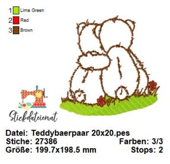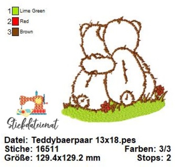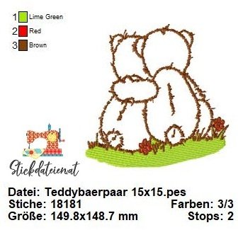 Eine digitale Stickdatei mit zwei umarmenden Teddybären, sitzend in einer malerischen Wiese