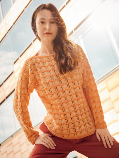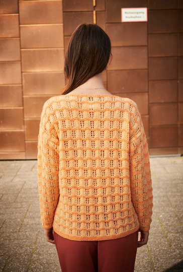 Dieser Pulli mit vertikal verlaufendem Lochmuster und U-Boot-Ausschnitt ist überaus vielseitig – die frische Farbkombination aus Apricot und Mandarine macht dein Alltagsoutfit frühlingsfit. Das sanfte, unaufdringliche Wellenmuster, erzeugt durch kraus rechts gestrickte mandarinfarbene Streifen zwischen apricotfarbenen Lochstreifen, geben dem Look eine feminine Note. Das weiche Garn aus einer Mischung von Alpaka, Schurwolle, Baumwolle und Polyamid lässt sich nicht nur angenehm verstricken, es trägt sich auch wunderbar auf der Haut. Eine Anleitung zum Downloaden steht in den Größen 38/40, 42/44 und 46/48 zur Verfügung.