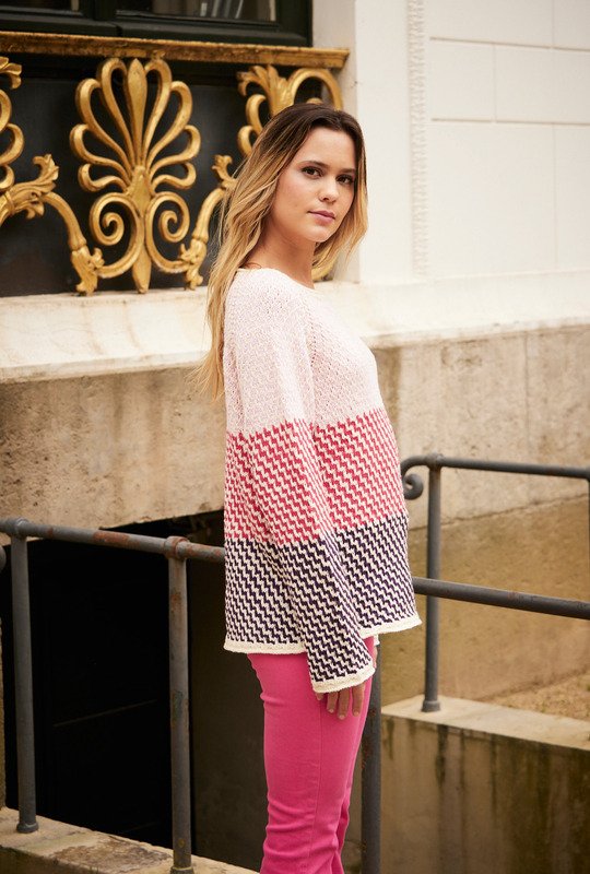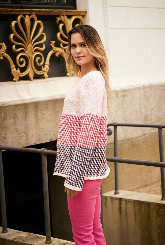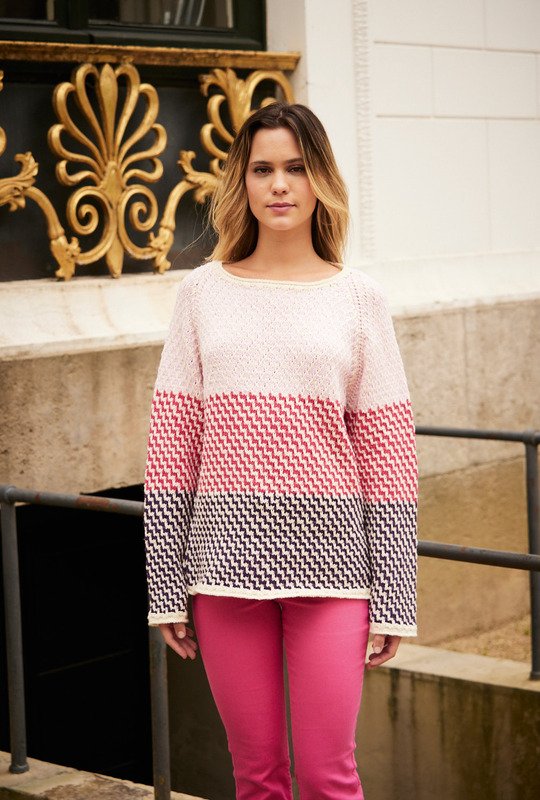 Bei diesem bequemen Raglanpulli im Hebemaschenmuster ist immer nur eine Farbe in Arbeit – mal ist es Aubergine, mal Pink und mal Rosa, stets kombiniert mit Natur. Dennoch ist das Modell aufgrund des eingearbeiteten Halsausschnitts sowie den Raglanärmeln anspruchsvoll zu stricken – was versierten StrickerInnen bestimmt das Herz höher schlagen lässt. Die Bündchen und die Halsausschnittblende werden aus Rippen und glatt rechts gestrickten Reihen in Natur gebildet. Reines Schurwollgarn lässt diesen Pulli zu einem Lieblingsstück deiner Garderobe werden. Eine Anleitung steht für die Größen 38/40, 42/44 und 46/48 zur Verfügung.