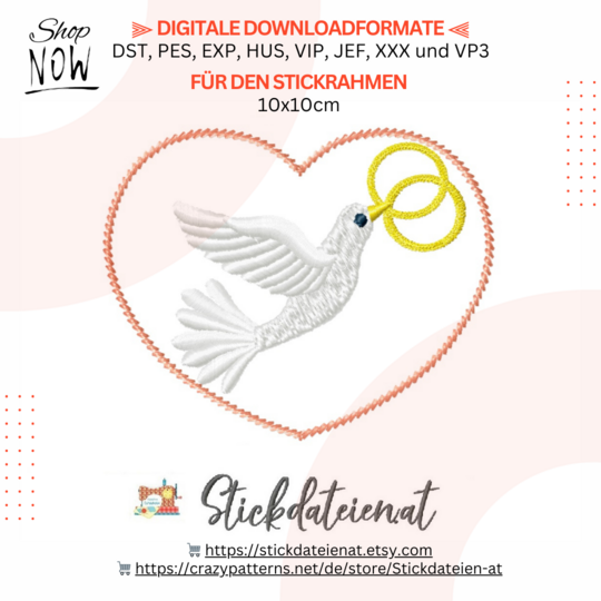 ️ Digitale Stickdatei "Weiße Taube mit Trauringen" – Zeichen der Liebe im Herzrahmen