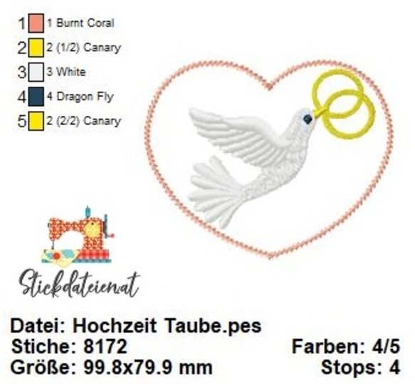 Feiere die Liebe mit unserer "Weiße Taube mit Trauringen" Stickdatei und bringe Eleganz und Symbolik in jedes Stück, das du schaffst. ️