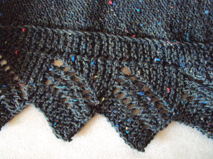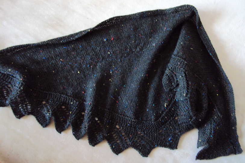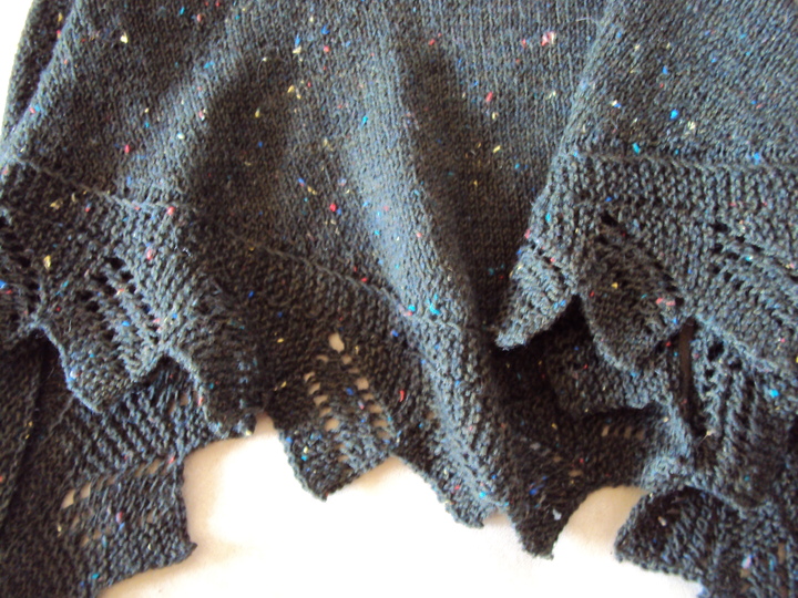Dieses Tuch wird in zwei Etappen gestrickt, zuerst die Zackenkante und dann den Tuchkörper in verkürzten Reihen. Die Anleitung ist ausführlich erklärt, aber ohne Strickkurs. Man sollte also schon etwas stricken können. Gestrickt wird mit Sockenwolle, man braucht insgesamt 100 g und eine Rundstricknadel N. 4