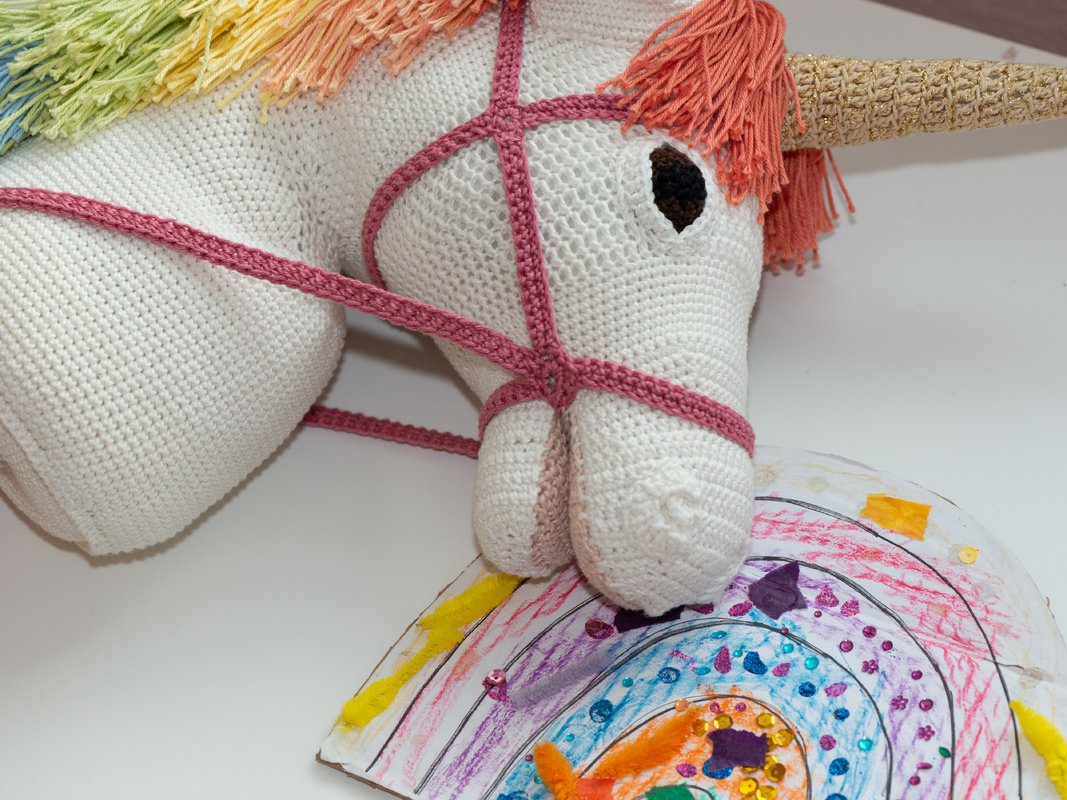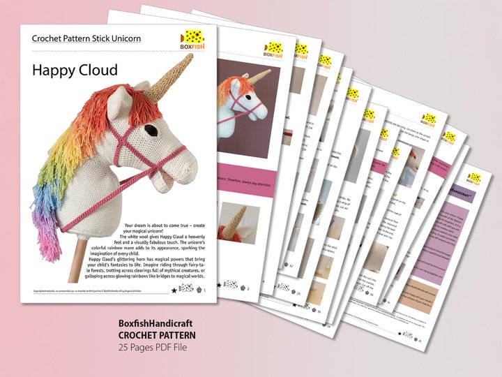 Tauche ein in die Freude des Häkelns. Mit dieser exklusiven Häkelanleitung kannst du ein zauberhaftes Geschenk für ein besonderes Kind erschaffen. Das Steckeneinhorn Wolkenfell ist mit der Schritt für Schritt Anleitung einfach zu erstellen und ist ein wahres Meisterwerk der Handarbeit. Es wird eine wahre Freude sein, wenn du dein selbstgehäkeltes Steckeneinhorn Wolkenfell dem Kind überreichst. Das Strahlen in den Augen, wenn es sein eigenes magisches Einhorn erhält ist unbezahlbar, denn Wolkenfell verzaubert Kinder in eine Welt voller Fabelwesen, in der der kindlichen Fantasie keine Grenzen gesetzt sind. Mit seinem fabelhaften Look, dem himmlischen weißen Wolken ähnelndem Fell, der Regenbogenmähne in voller Farbenpracht und dem goldenes Horn, lässt es jedes Kinderherz höher schlagen. Und ja, sein glitzerndes Horn erfüllt im Spiel jeden Wunsch, so dass das Kind abtauchen kann in seine eigenes Zauberland. Ob Schritt, Trapp oder im Galopp, Wolkenfell liebt Ausritte durch Feenwälder und über leuchtende Regenbögen. Ob drinnen oder draußen, das Steckeneinhorn Wolkenfell ist jederzeit eine liebevolle Begleitung, ein treuer bester Freund ein wahrer Glücksgarant für unsere liebenswerten Kinder.