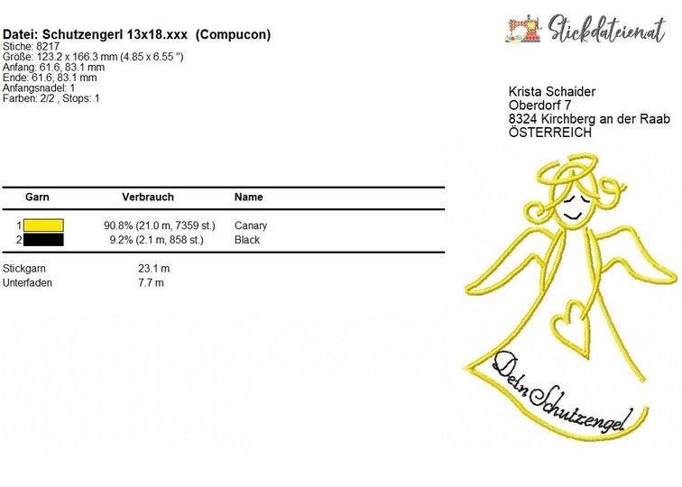Mit hochwertigen Stickgarnen und einer präzisen Stickmaschine kannst du die bestmöglichen Ergebnisse erzielen und deinen Stickprojekten einen Hauch von himmlischer Güte verleihen. Lass deiner Vorstellungskraft freien Lauf und experimentiere mit verschiedenen Farben und Texturen, um das schützende und tröstliche Wesen des Schutzengels zu unterstreichen.