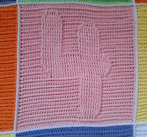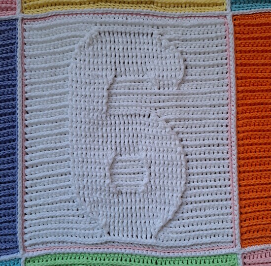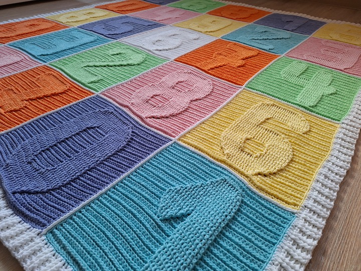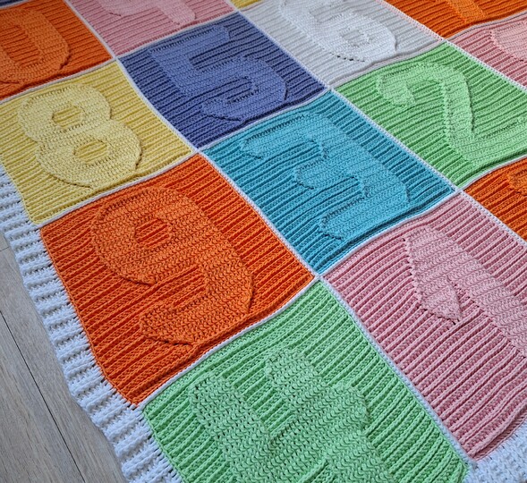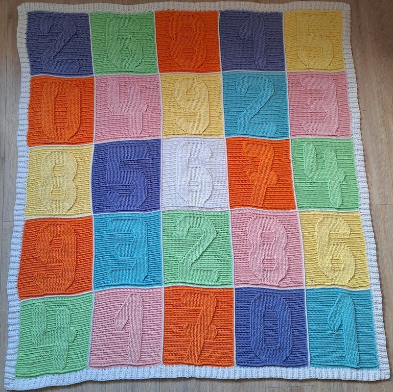 Die Decke lässt sich durch Variation der Anzahl der gehäkelten Ziffern auf verschiedene Größen anpassen.
