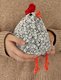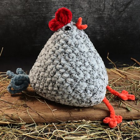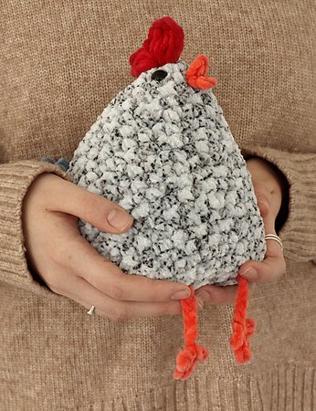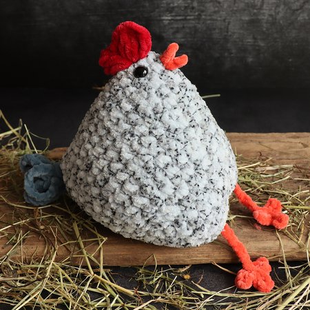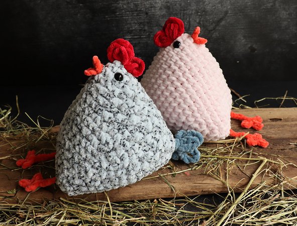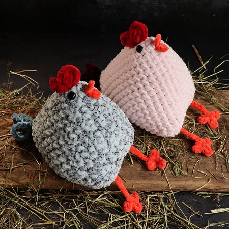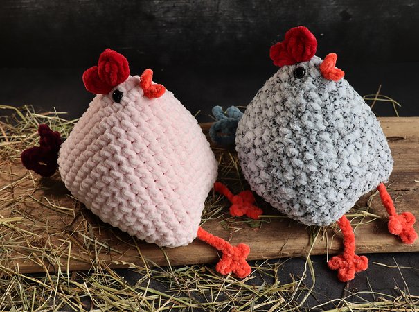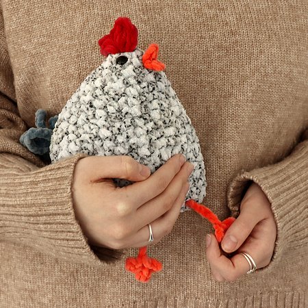 So schön frech, knuffig und weich sind diese Hühner, dass man sie einfach lieb haben muss. Mit der dicken Chenillewolle gehen sie wirklich flott von der Hand und sind ein wunderbares Wochenend- ober Abendprojekt. Der Körper wird in Runden mit festen Maschen gehäkelt, die Schwanzfedern und der Kamm werden direkt an den Körper gehäkelt. Die Beinchen sind zusammenhängend und werden mit eingearbeitet. So musst du am Ende lediglich den Schnabel anbringen und eine Naht schließen, ansonsten ist kein Annähen nötig.