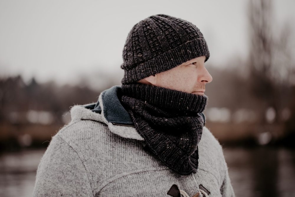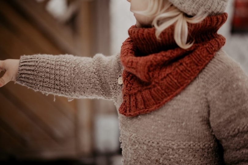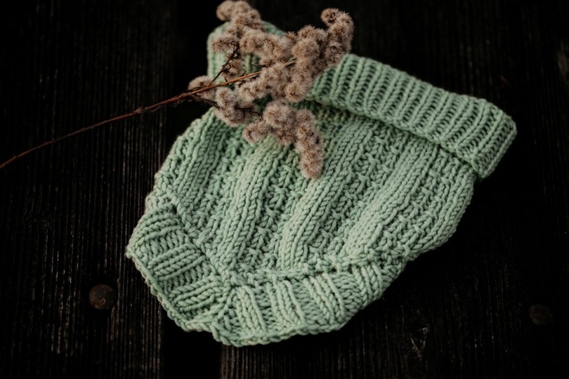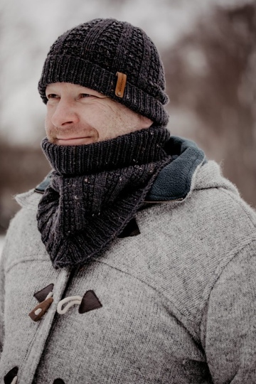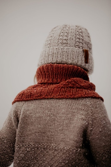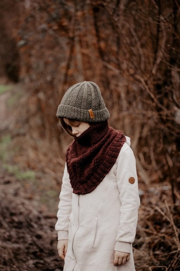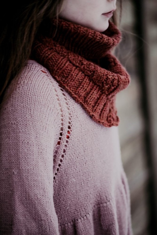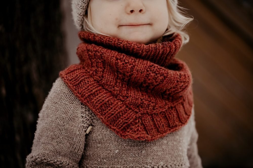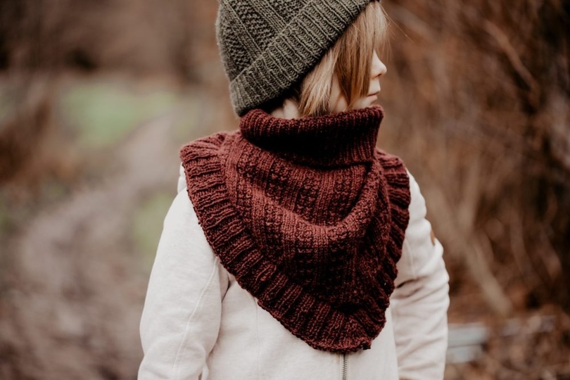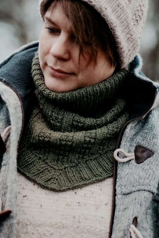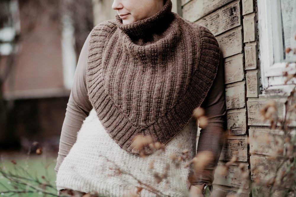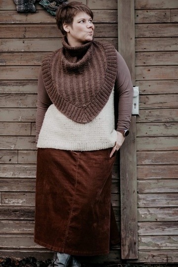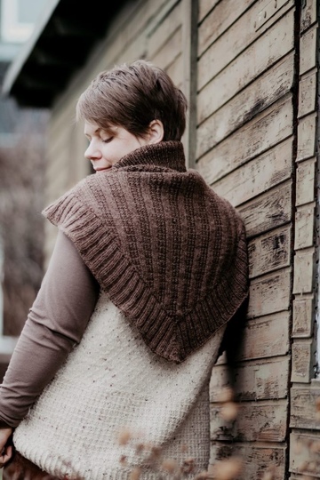 Der Ris Cowl wird nahtlos von oben nach unten, zuerst in Runden und dann in Reihen gestrickt. Der Latz wird durch Abnahmen geformt und zur Abrundung wird der gesamte Cowl am Ende mit einem breiten Bündchen umstrickt.