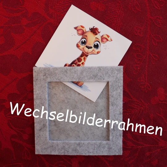 In diesem Set basteln wir 20 Wechselbilderrahmen aus Filz. In die Bilderrahmen legen wir unsere Lieblingsbilder ein. Als Motive nehme ich gern Familienfotos, Urlaubsbilder oder für meine Enkel niedliche Tierbilder bzw. Bilder ihrer neuesten Comic-Helden. Auch habe ich immer Fotos in Reserve, die meine Enkel vor dem Spielen gern selbst auswählen und in die Bilderrahmen einlegen.