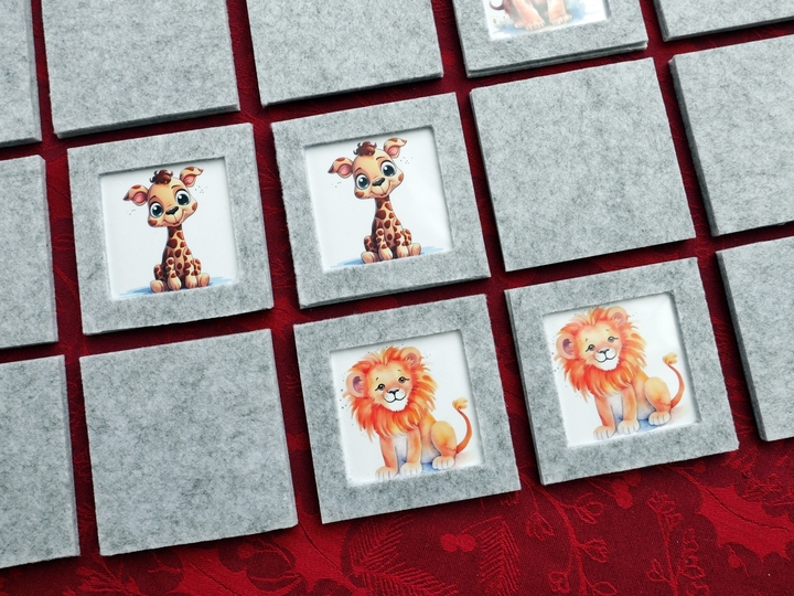 Wir basteln ein Set mit 20 Wechselbilderrahmen. Jeder Filzrahmen ist 10 x 10 cm groß und ca. 8 mm dick. Das Memory-Spiel ist für alle Altersgruppen geeignet.