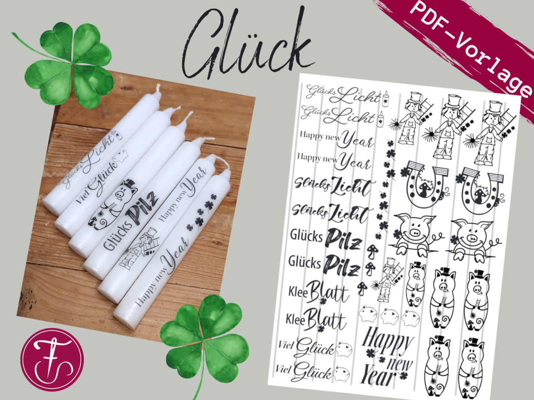 eine wunderschöne pdf-Vorlage im A4-Format, die eine kleine Auswahl glücksbringender Bilder wie Schornsteinfeger, Schweinchen, Pilz und Sprüche beinhalten.