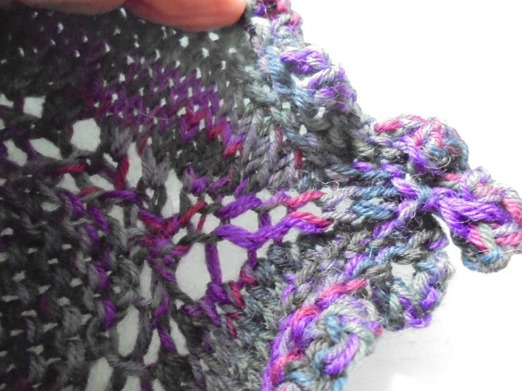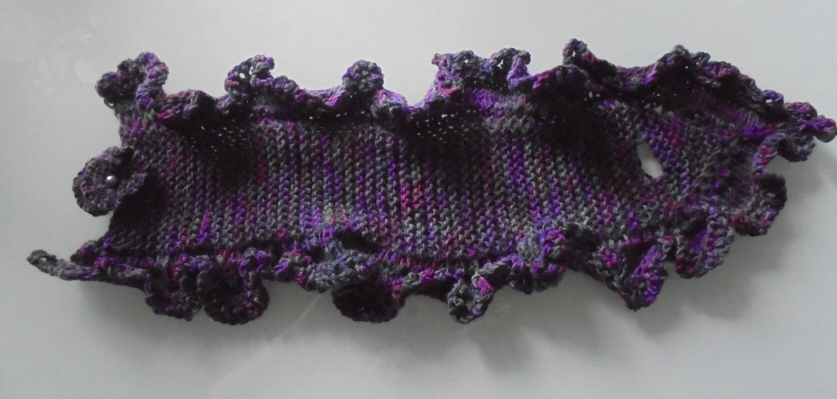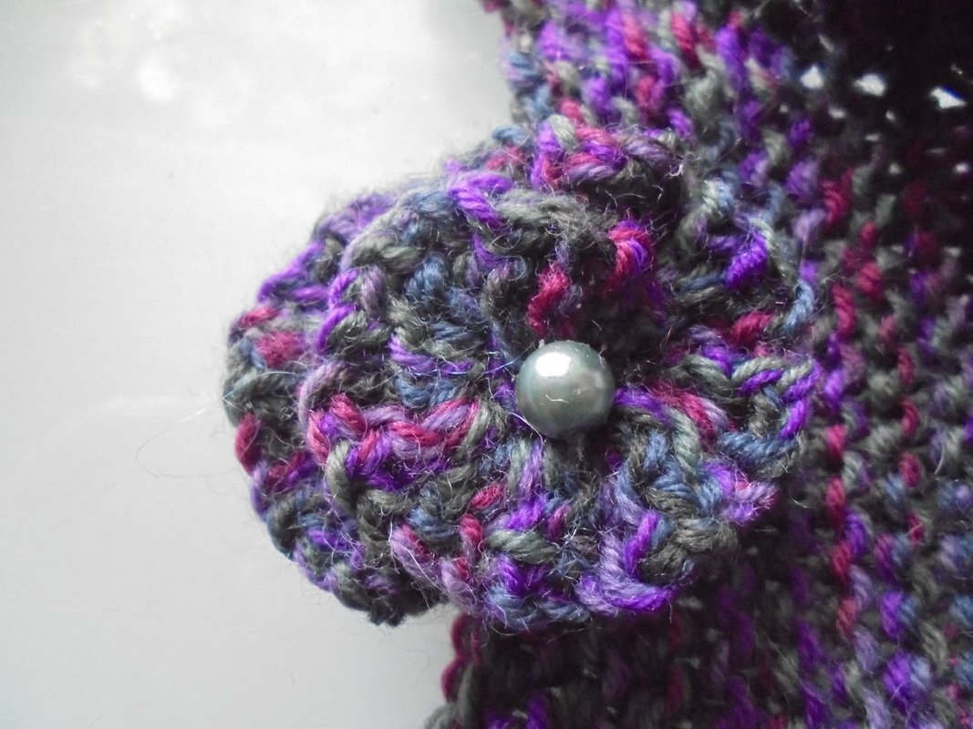 Dieser schmucke Halswärmer ersetzt den Schal. Er wird aus Sockenwolle gestrickt. Die gehäkelte Rosette mit Perle dient als Verschluß. Wenn Sie die Rosette mit einer Broschennadel versehen, haben Sie eine zusätzliche Brosche, die Sie auch anderweitig verwenden können.